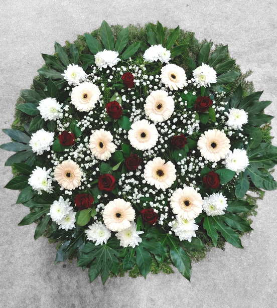 • Piezīmes: Vainags ar baltām gerberām. Gaišs ziedu salikums. Universāls risinājums.